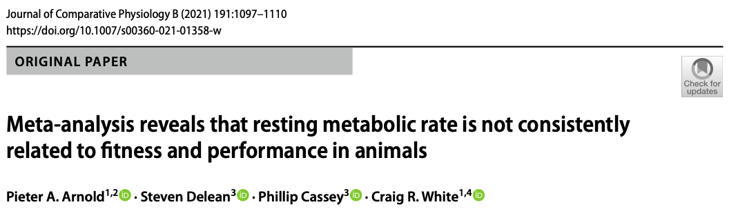 Arnold, P. A., Delean, S., Cassey, P. and White, C. R. (2021). Meta‐analysis reveals that resting metabolic rate is not consistently related to fitness and performance in animals. Journal of Comparative Physiology B 191, 1097–1110.